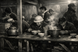 「飯場(はんば)」と呼ばれる現場近くの寮兼食堂には、作業員のためのご飯を作るおばさん、お姉さんもいました。知り合いや近所の大人たちも、皆、親切に接してくれました。